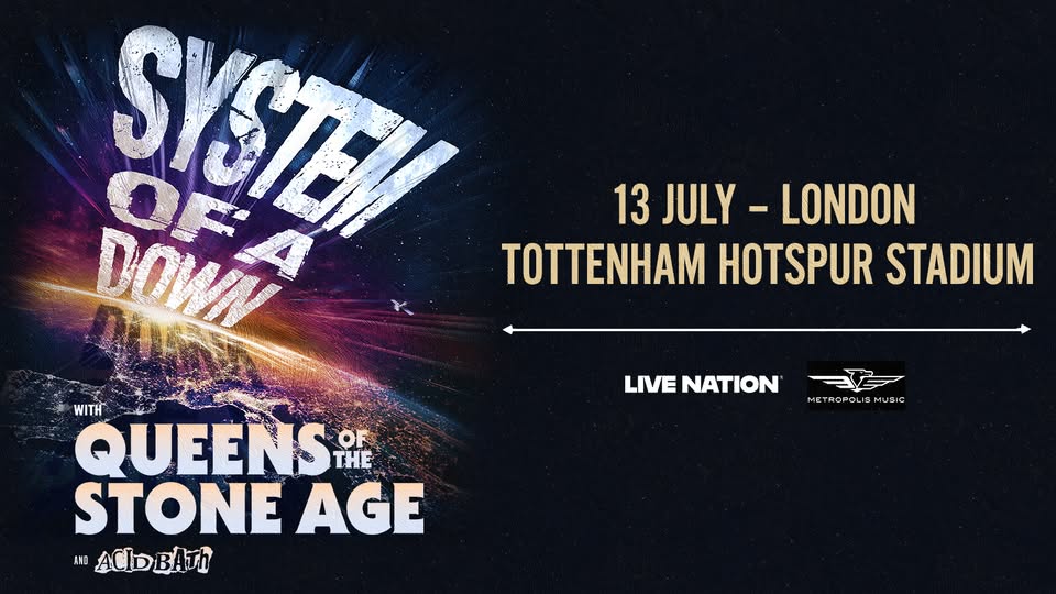 The influential Armenian-American alternative metal band returns to the UK for a massive show, performing their politically-charged hits like "Chop Suey!" and "Toxicity." Joined by special guests Queens of the Stone Age and Acid Bath.